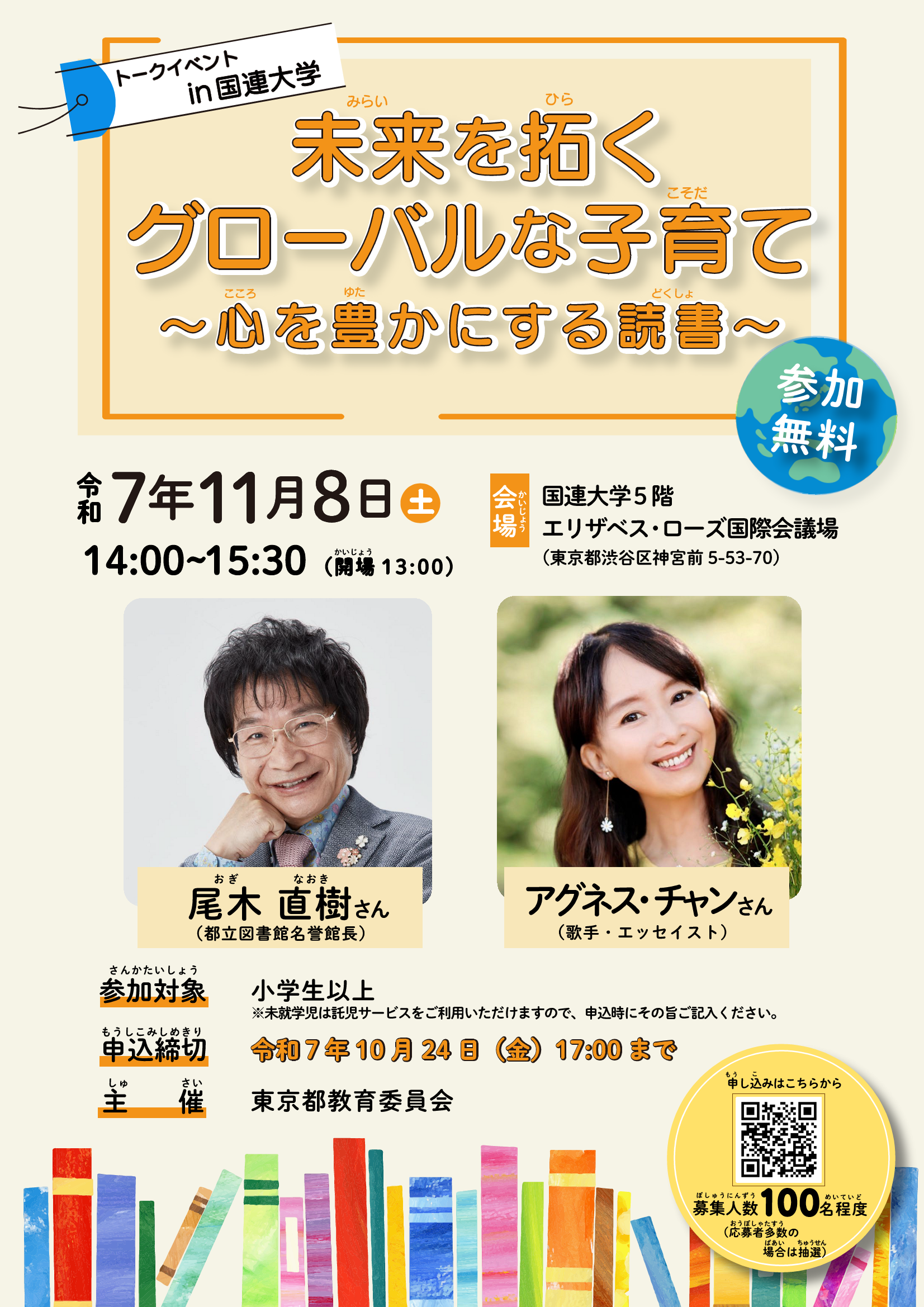 このたび東京都教育委員会では、子供読書活動の推進に向けた取り組みとして、歌手でエッセイストのアグネス・チャンさんをお招きし、都立図書館名誉館長の尾木ママとのトークイベントを国連大学を会場に、開催いたします。