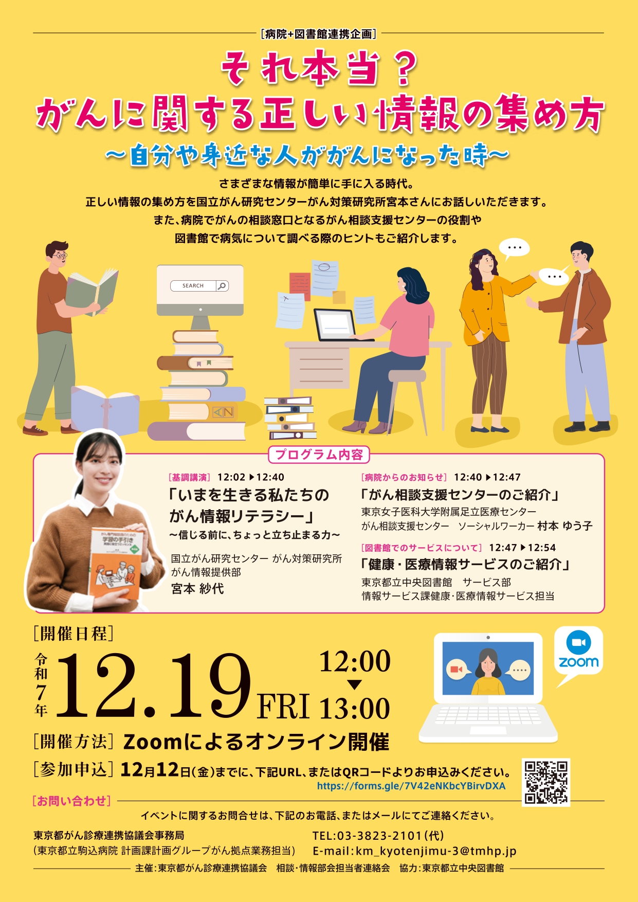 さまざまな情報が簡単に手に入る時代。正しい情報の集め方を国立がん研究センターがん対策研究所宮本さんにお話しいただきます。また、病院でがんの相談窓口となるがん相談支援センターの役割や図書館で病気について調べる際のヒントもご紹介します。