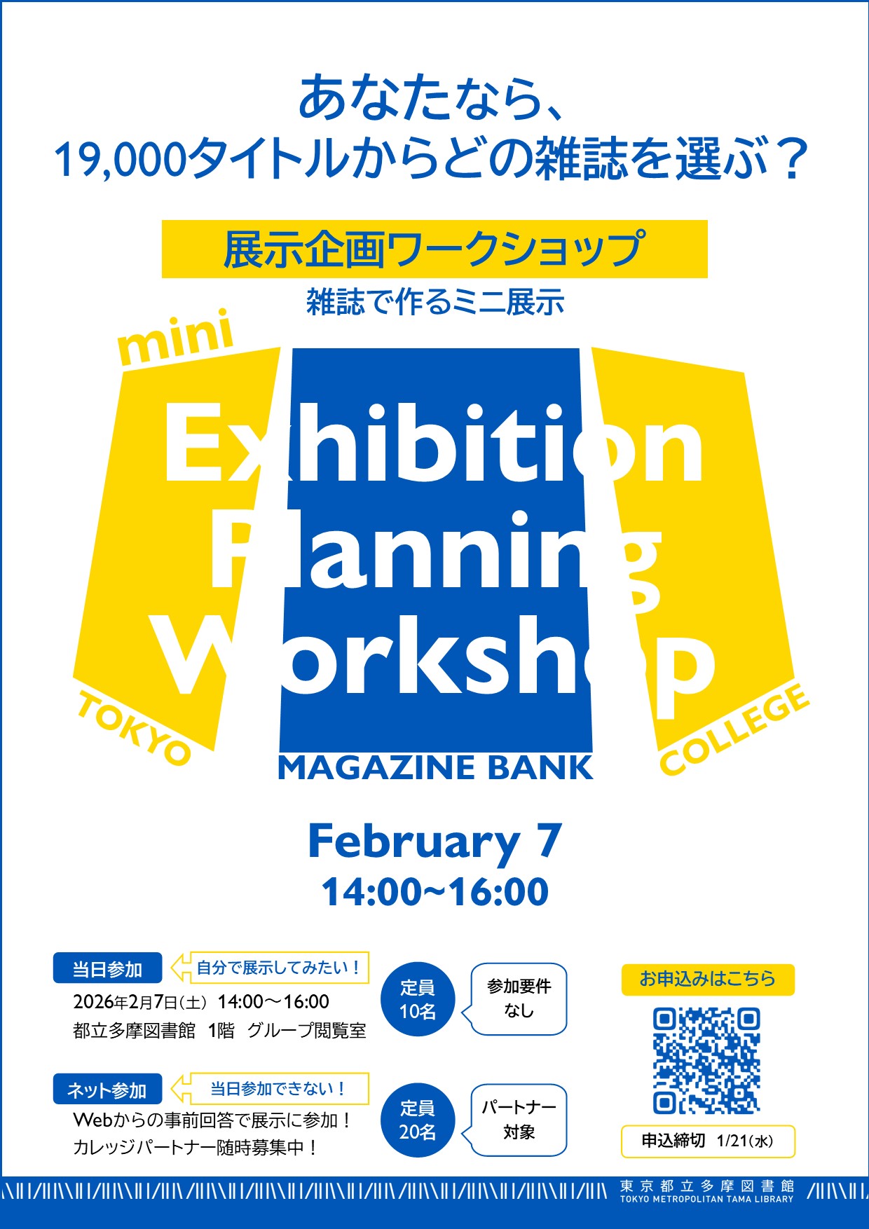 東京都立多摩図書館では豊富な所蔵雑誌を活用し、「東京マガジンバンクカレッジ」という学びと交流の拠点を作り上げることを目指す活動に取り組んでいます。その一環として、雑誌を題材にしたミニ展示の企画を体験できるワークショップを開催します。