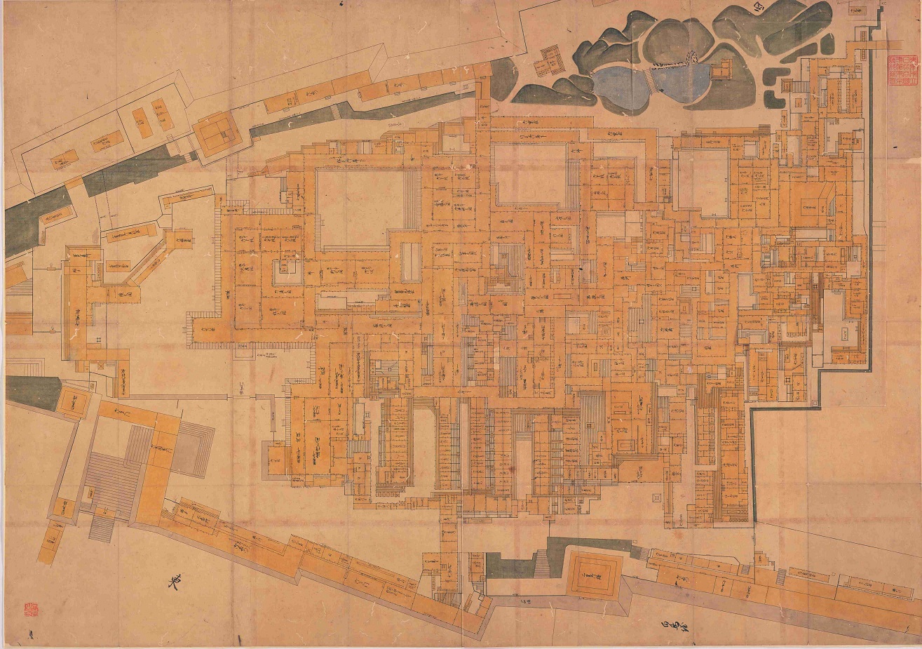 This is a plan of modifications to the buildings first constructed in the Manji period (1658-1661) fol- lowing the Great Fire of Meireki in 1657.