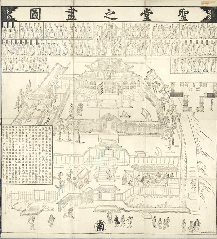 のちの昌平坂学問所となる湯島聖堂を描いた絵図です。寛永9年(1632)、林羅山は、尾張藩主徳川義直の援助を受けて、上野忍岡の家塾の邸内に孔子を祭るための廟堂・先聖殿を創建しました。元禄3年(1690)、5代将軍綱吉は、先聖殿を神田湯島に移転することを命じ、元禄4年(1691)に竣工しました。林家の家塾もこちらに移動し、湯島聖堂と呼ばれるようになりました。この絵図は移転後の様子を伝えるもので、ここで行われた儒学の講義を聴きに多くの人が集まったといいます。
