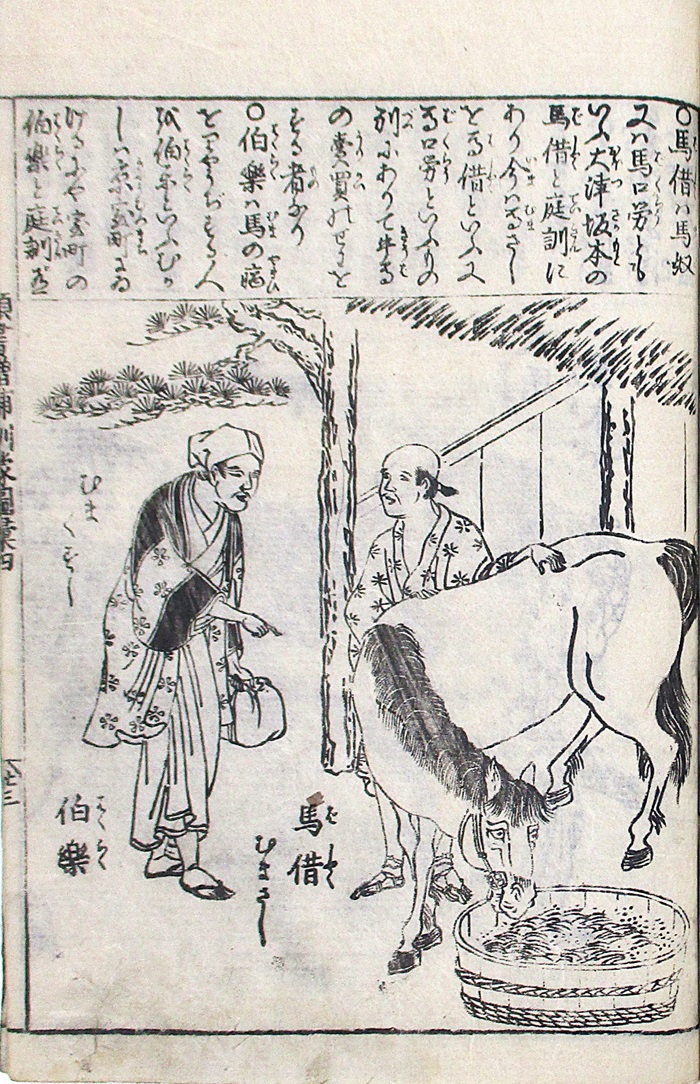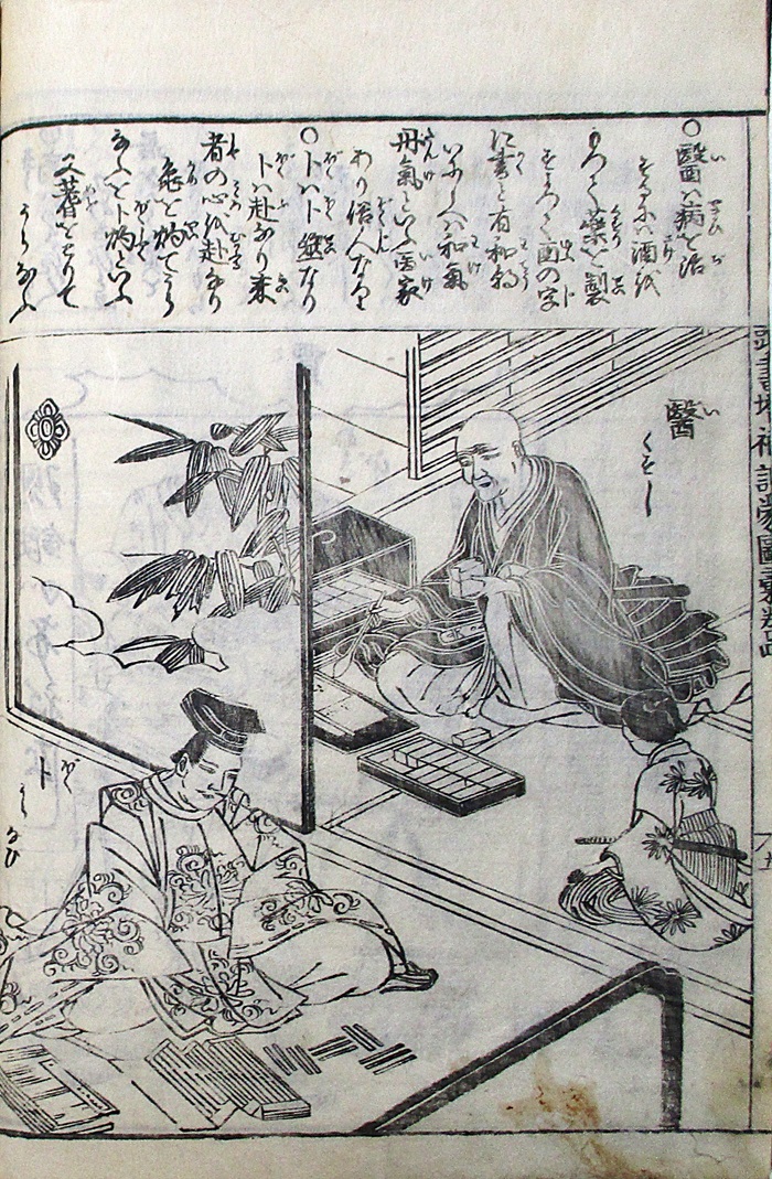江戸時代の挿絵入り百科事典に描かれた医師の姿です。薬剤師でもあった医師は、「くすし」とも呼ばれました。同書には、製薬の道具である薬研(やげん)も描かれています。舟形の底の部分に生薬を入れ、すり潰して粉にします。また、獣医である「伯楽(はくらく)」の姿も描かれています。伯楽は馬薬師、あるいは馬医とも呼ばれ、牛馬の病を治しました。