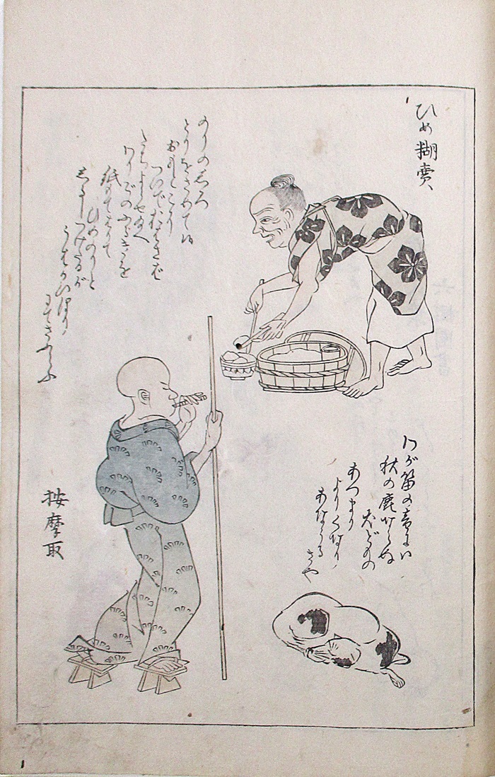 職人を描いた歌合に登場する「按摩取」です。患部を揉んだりさすったりして治療をします。これは得意先を決めずに笛を吹きながら町を流す「ふり」の按摩の様子です。