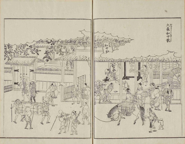 食傷の薬「和中散(わちゅうさん)」の江戸店の様子です。江戸と京を結ぶ東海道には53の宿場があり、そのいくつかには旅人の災難を救う道中薬がありました。その効能が人づてに伝わり、販路を広げていったのが江戸売薬で、和中散もその一つでした。和中散本舗は草津宿と石部宿の「間の宿」(あいのしゅく)として栄えた六地蔵にあり、現在その建物は国の重要文化財に指定されています。画像は江戸の大森にあった和中散の出店で、多くの人でにぎわっている様子が描かれています。