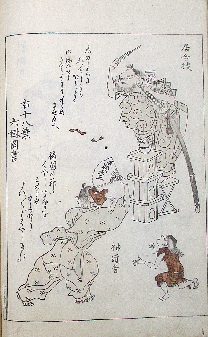 江戸時代には、香具師(やし)と言われる薬を売り歩くグループがありました。画像のようにこまを回したり、居合抜きをしたりして人を集め、薬を売りました。香具師は矢師ともいい、これは当て字で、本来は野士すなわち野武士のことであるといいます。野武士たちが、生活の糧を得るために、売薬を始めたことによるそうです。