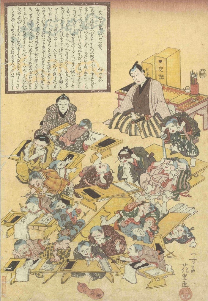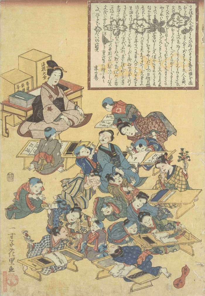 寺子屋の授業風景を描いた二枚続きの錦絵です。「始の巻」では男性の師匠が、「末の巻」では女性の師匠が教える様子が描かれていますが、子供たちの多くは思い思いの行動を取っていることがわかります。江戸時代の寺子屋は、生徒は必ずしも先生の方を向いて座るわけではなく、教科書も、生徒たちの年齢もばらばら、出席するのも欠席するのも自由でした。