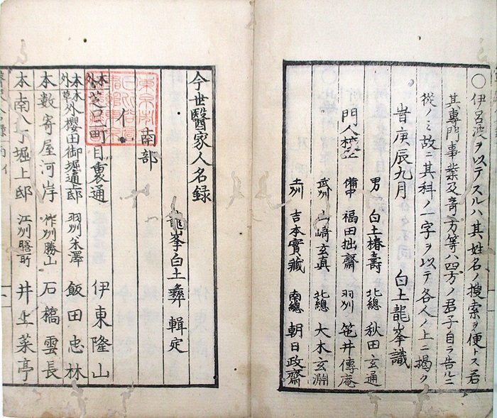 江戸在住の医師名簿で、文政2年(1819)に発行された『江戸今世医家人名録(えどきんせいいかじんめいろく)』(当室未所蔵)の続編です。4巻4冊構成で、江戸在住の医師を東西南北に分かち、それぞれいろは順に登載しています。各人の上には専門事業を表す科の一字が記載されています。例えば画像の「本」は本道(内科)、「外」は外科です。当室の所蔵は南の1冊のみです。