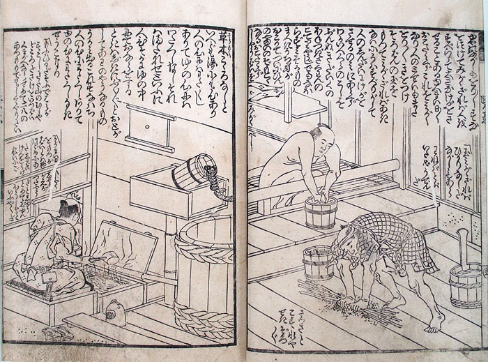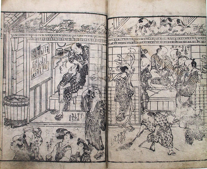江戸の町は風が強く、土埃で汚れるため、毎日湯に入る習慣がありました。しかし、内風呂を持つ家は少なく、湯屋(銭湯)を利用することが普通でした。火事への恐れや、江戸は水が豊富ではないこと、燃料となる薪が高いことなどが理由と考えられています。この絵は、湯屋での人間模様を描いた山東京伝による黄表紙で、左の絵は、湯屋の従業員が、体を洗う「流し」を掃除している場面です。「湯屋の流しも、折々砂をつけて磨かざれば、人を滑らして大きな怪我をさせることあるゆへ、毎日々々怠らず、これを磨くなり」と書かれています。右の絵は湯屋の2階の様子を描いています。男湯の2階は別料金で利用できる休憩所になっており、お茶を飲んだりお菓子を食べたりしながら、世間話や囲碁将棋に興じることのできる社交場でした。