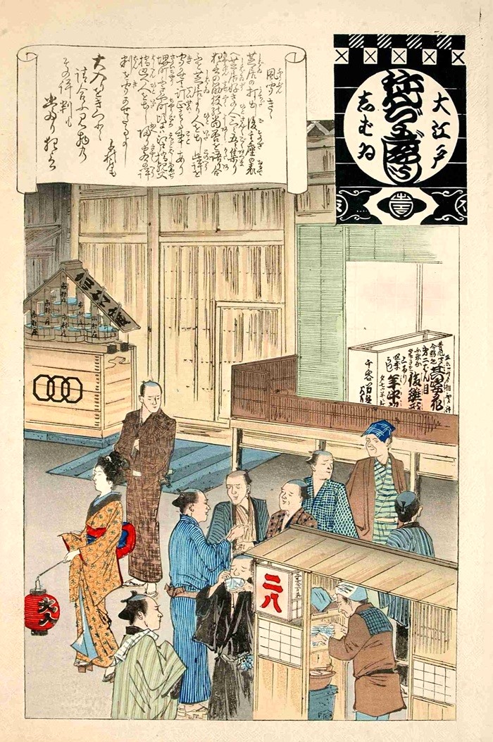 奥に見えるのは「八百善」の暖簾です。享保2年(1717)に創業した「八百善」はもとは八百屋でした。代々当主が栗山善四郎を名乗ったことから、八百屋善四郎を縮めて「八百善」となり、二代目の頃より仕出し料理を出すようになります。当時江戸一番といわれる料亭となった八百善は、贅を凝らした料理で金持ちや文人に好まれ、飛びぬけて繁盛しました。