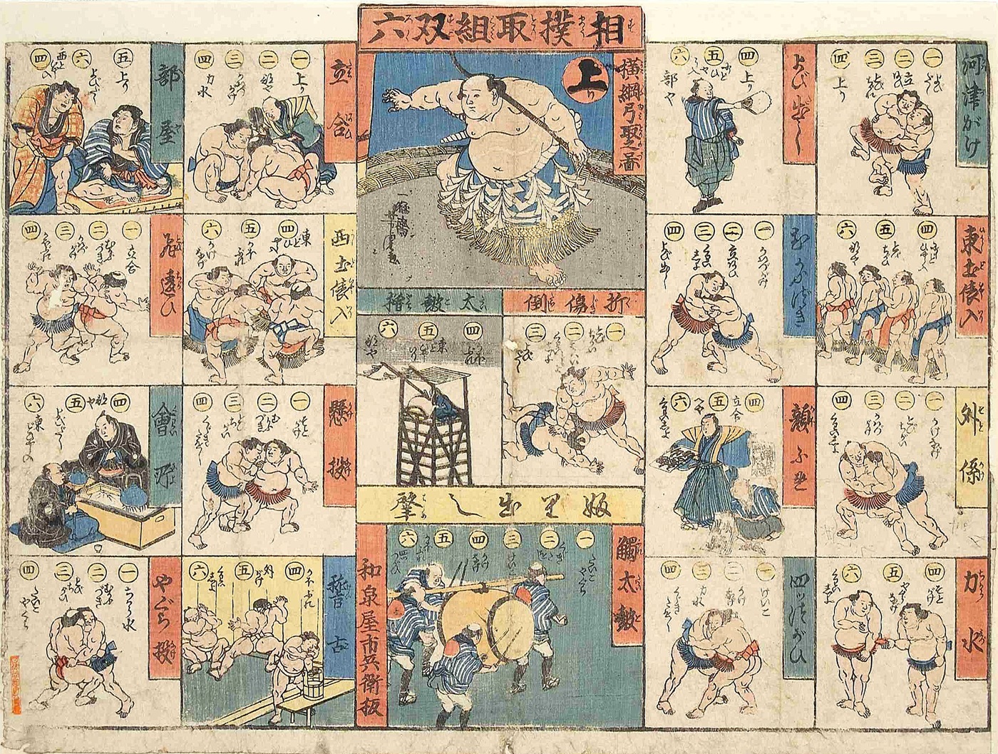 相撲をテーマにした絵双六です。コマには、土俵入りや多くの相撲の技が紹介されています。振り出しは興行の開始を告げる「触れ太鼓」、上りは「横綱弓取之図」となっています。